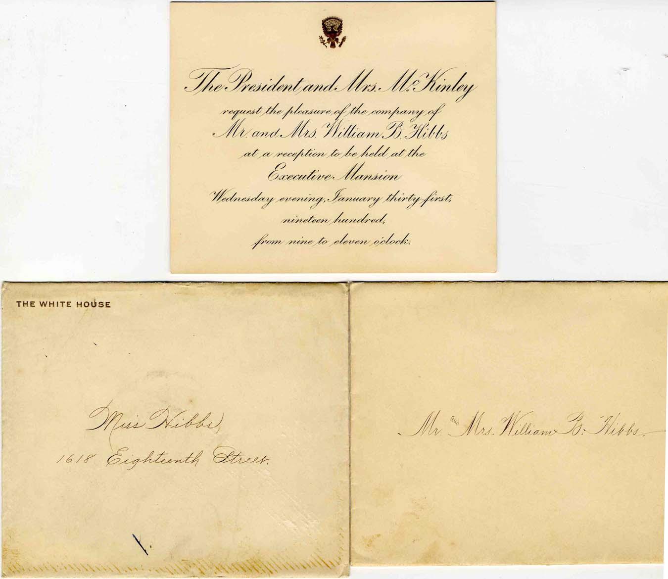 Very nice William McKinley White House invitation with gold Presidential seal. 5.5'' x 4.5'' card invites a Mr. and Mrs. William B. Hibbs to a reception at the Executive Mansion on 31 January 1900. With two envelopes -- one to Miss Hibbs with embossed ''White House'' return address, and one to the couple with a gold Presidential seal. Invitation in near fine condition; envelopes in very good condition.