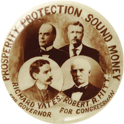<B>McKinley & Roosevelt: A Rare 1¼" Illinois Quadragate.</B></I> This superb sepia-toned design pictures the presidential ticket for 1900 along with gubernatorial and congressional candidates. These "coat-tail" issues are highly prized by collectors, and this variety is one of the best. Choice condition.<BR><BR><b>Shipping:</b> Small Flat (<a target="_blank" href="http://www.heritageauctions.com/common/shipping.php">view shipping information</a>)