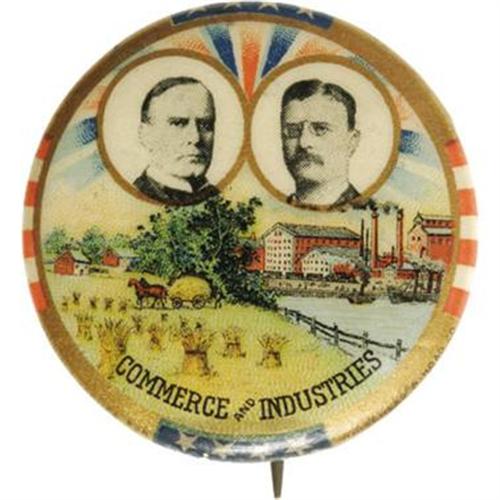 <B>McKinley & Roosevelt: 1900 "Commerce and Industries" 1¼" Jugate Pinback.</B></I> A popular and attractive color button with the candidates' portraits amid patriotic bunting placed above prosperous American landscapes. A bumper wheat harvest is next to a working factory along a busy wharf. Just a tad off-center, else very fine condition. This button evokes the same can-do spirit as was promoted by the "Full Dinner Pail" slogan from the same campaign.<BR><BR><b>Shipping:</b> Miscellaneous Collectibles, Smal (<a target="_blank" href="http://www.heritageauctions.com/common/shipping.php">view shipping information</a>)