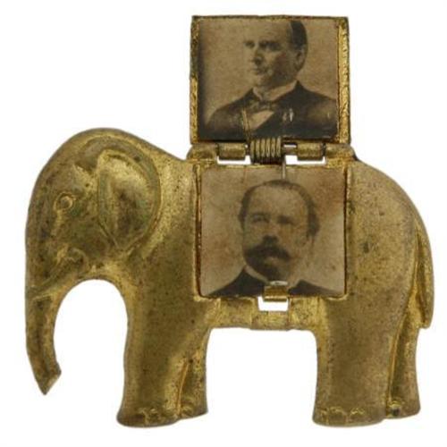 <B>McKinley and Hobart: Mechanical Elephant Pin</B></I> with original paper photos. Made of thin metal, this 1" elephant's saddle is made to flip open to view the candidates. the item is complete with spring mechanism and catch in choice condition.<BR><BR><b>Shipping:</b> Miscellaneous Collectibles, Smal (<a target="_blank" href="http://www.heritageauctions.com/common/shipping.php">view shipping information</a>)