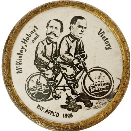 <B>Very Rare 1896 McKinley & Hobart "Bicycle Built for Two" 1 1/8" Jugate.</B></I> "McKinley, Hobart, and Victory" surrounds the images of the candidates. The Capitol Building appears in one wheel, the White House in the other. Convex celluloid surface, with integral brass rim and pin on reverse. With the blue celluloid with a similar theme selling at stratospheric prices, this equally-rare variety is a great alternative. Choice condition. <I>From the Norman Loewenstern Collection.</B></I>