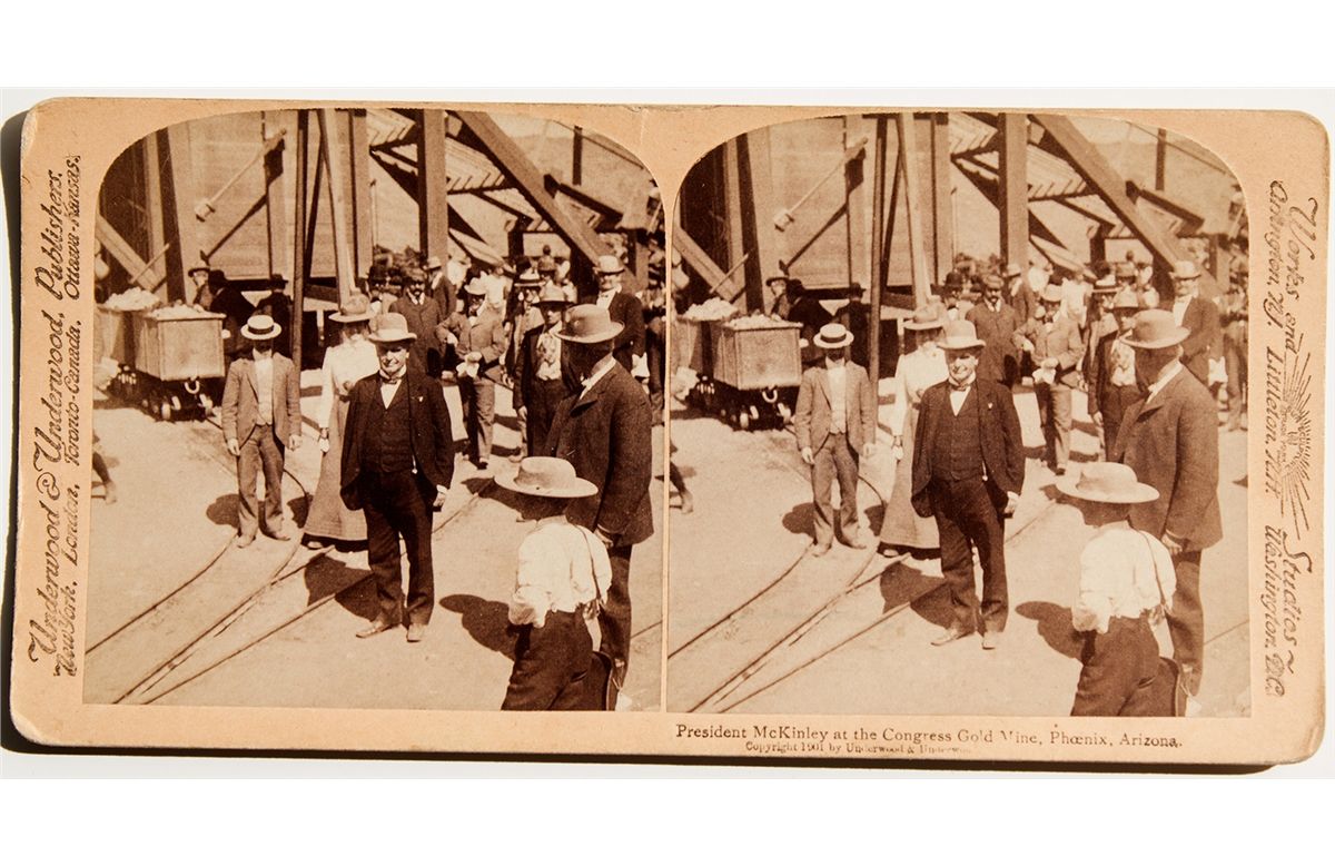 1901 This is a stereo view taken during President William McKinley’s visit to Phoenix and the rest of the Southwest in 1901. This particular view is of his visit to the Congress Mine near town. The photo is clear but has a bit of bleaching on the right panel. There is no photographer named on it. Bud Bassett Collection - HKA#65456