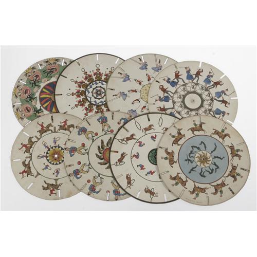 <B>McLean's Optical Illusions; or Magic Panorama,</B></I> Set of nine phenakistoscope discs, 9.5" diameter each, T. McLean, London, 1833. The phenakistoscope was very early forerunner of today's deluxe, special effects-driven movie. Invented by Joseph Plateau in 1832, it was spun on an axis and viewed in a mirror. Like a cartoon flip book, the phenakistoscope relied upon rapidly moving images to simulate motion. The phenakistoscope enjoyed a brief popularity in the 1830's, however was soon displaced by animated illusions that were considerably more "user friendly". The discs making up this set are illustrated, respectively, with a jockey on horseback, a dancing couple, a leaping horse, a juggler, an equestrian, a woman beating a man, a girl on a swing, an East Indian court jester, and an ogre eating a lawyer. The drawings on each disc are meticulously rendered in color. Housed in a sturdy card binder with marbleized covers. Split on cover's spine, discs range in condition from Very Fine to Very Good. All are ready to spin and guaranteed to amuse. From the Henry E. Luhrs Collection.
