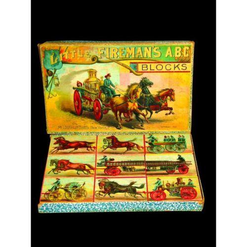 McLoughlin Bros NY Little Firemans ABC Blocks, 1893. One end of original box missing otherwise excellent condition. 13 X 8 inches.