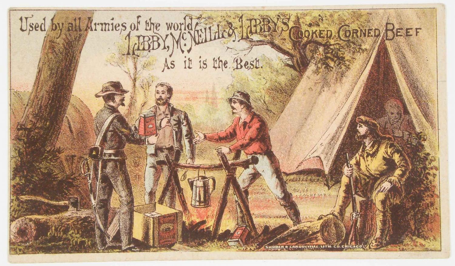 Libby, McNeill & Libby Cooked Corned Beef Trade Card. "Used by all the armies of the world, as it is the best. Very good condition. 4 3/4 X 2 3/4 inches.