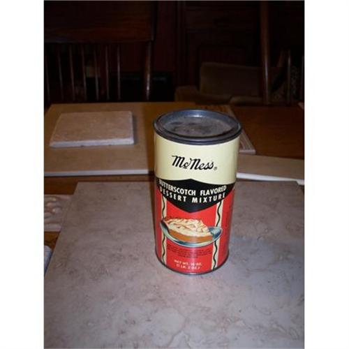 This is a nice McNess Butterscotch Flavored Dessert Mixture tin.I love the orange,cream and black colors on this brand of tin.Very eyecatching.In very good condition.Stands 6" tall.