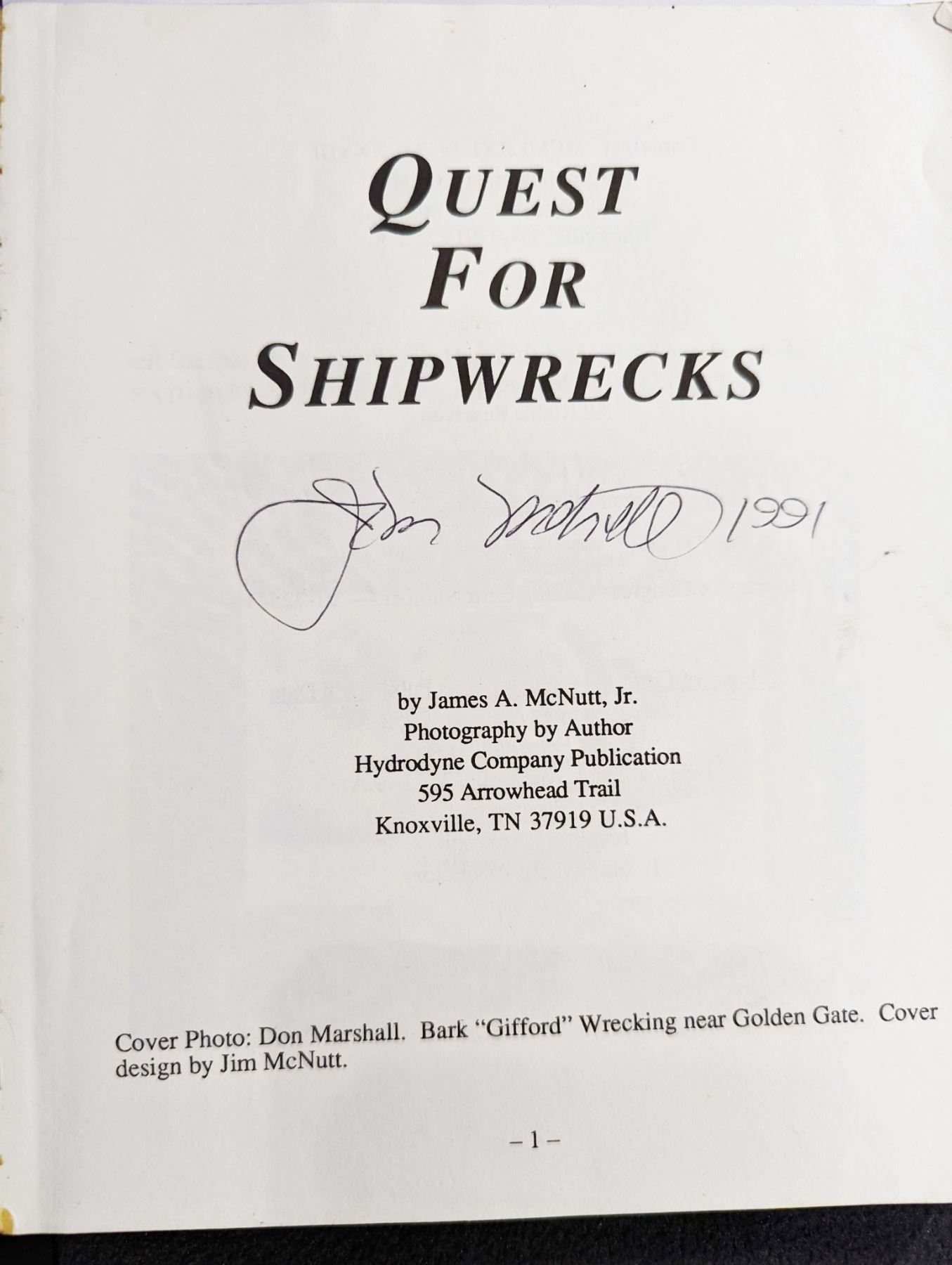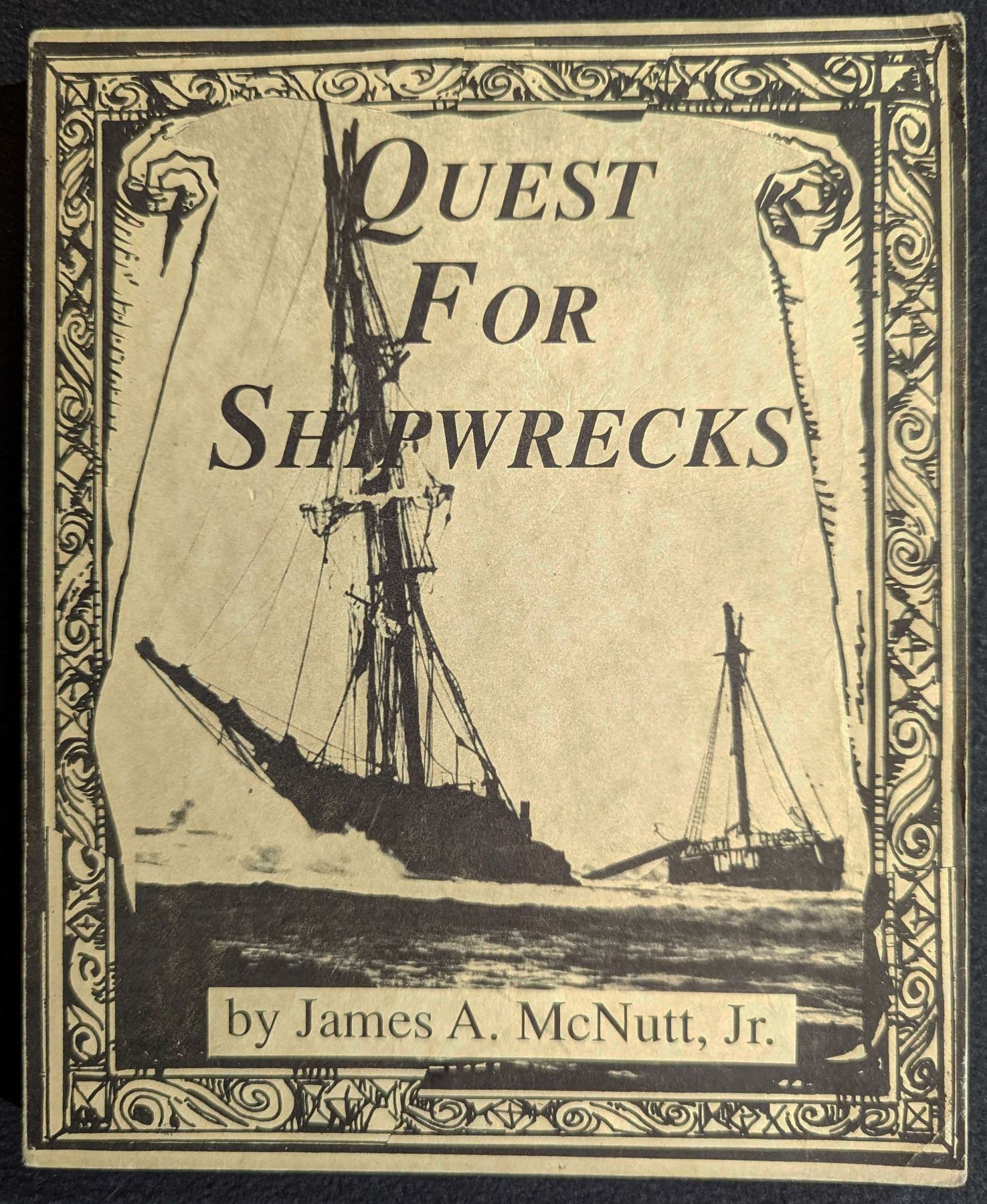 McNutt, James A., Jr. QUEST FOR SHIPWRECKS. Hydrodyne Company Publication. 1991. 8vo. 202, (2) pages. Knoxville. first edition. original tan printed card covers. illustrations. tables. maps. signed by the author. near Fine. This book is a guidebook written with experienced reference for the sea and shipwrecks. Authentic and detailed in every aspect of shipwrecks. A genuine list of unfound galleons and ships of the Caribbean. Lot weight: 0 lbs 15oz. Subject(s): Shipwrecks.