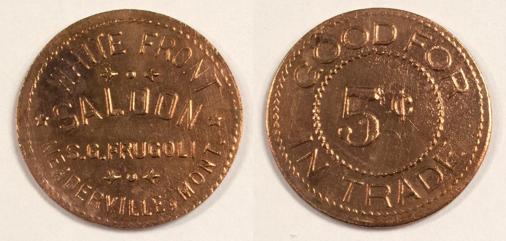 Obv.: White Front / Saloon / S.G. Frugoli /Meaderville, Mont.; rev.: Good For / 5c / In Trade.