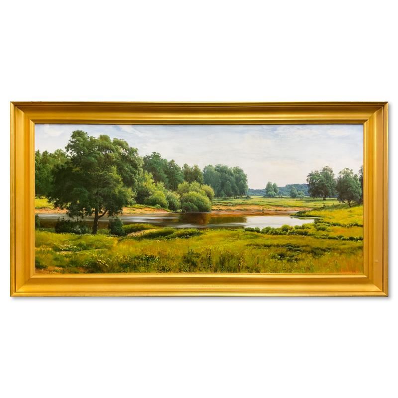 "Meadow by the River" is an original oil painting on canvas by Igor Prishepa, hand signed by the artist. This piece comes framed. Includes Letter of Authenticity. Measures approx. 29.5" x 56.5" (frame), 23" x 50" (image). There is some wear on the frame.