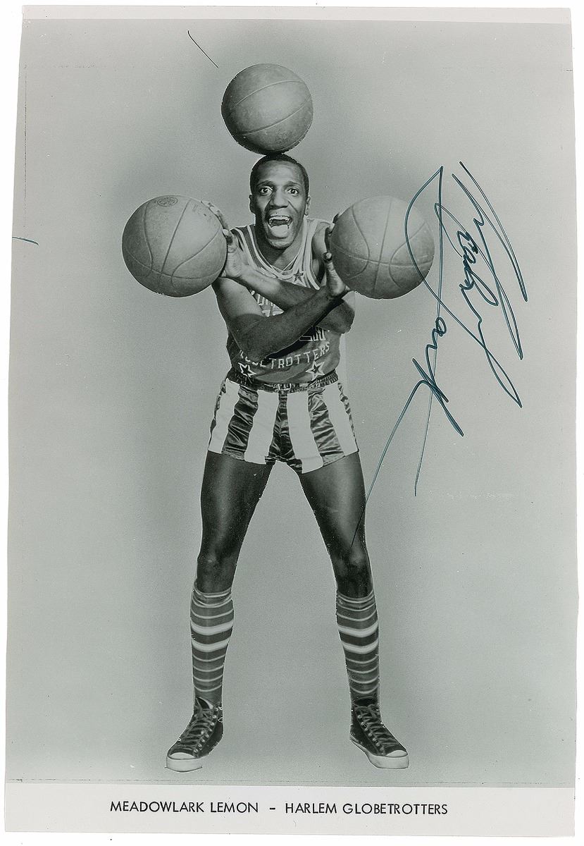 American basketball player, actor, and Christian minister (1932–2015) better known as the ‘Clown Prince’ of the Harlem Globetrotters; he was inducted into the Naismith Memorial Basketball Hall of Fame in 2003. Seldom-seen glossy 6.75 x 9.75 full-length photo of Meadowlark Lemon playing around with three basketballs in his Harlem Globetrotters uniform, signed in black felt tip. In fine condition, with trimmed edges.