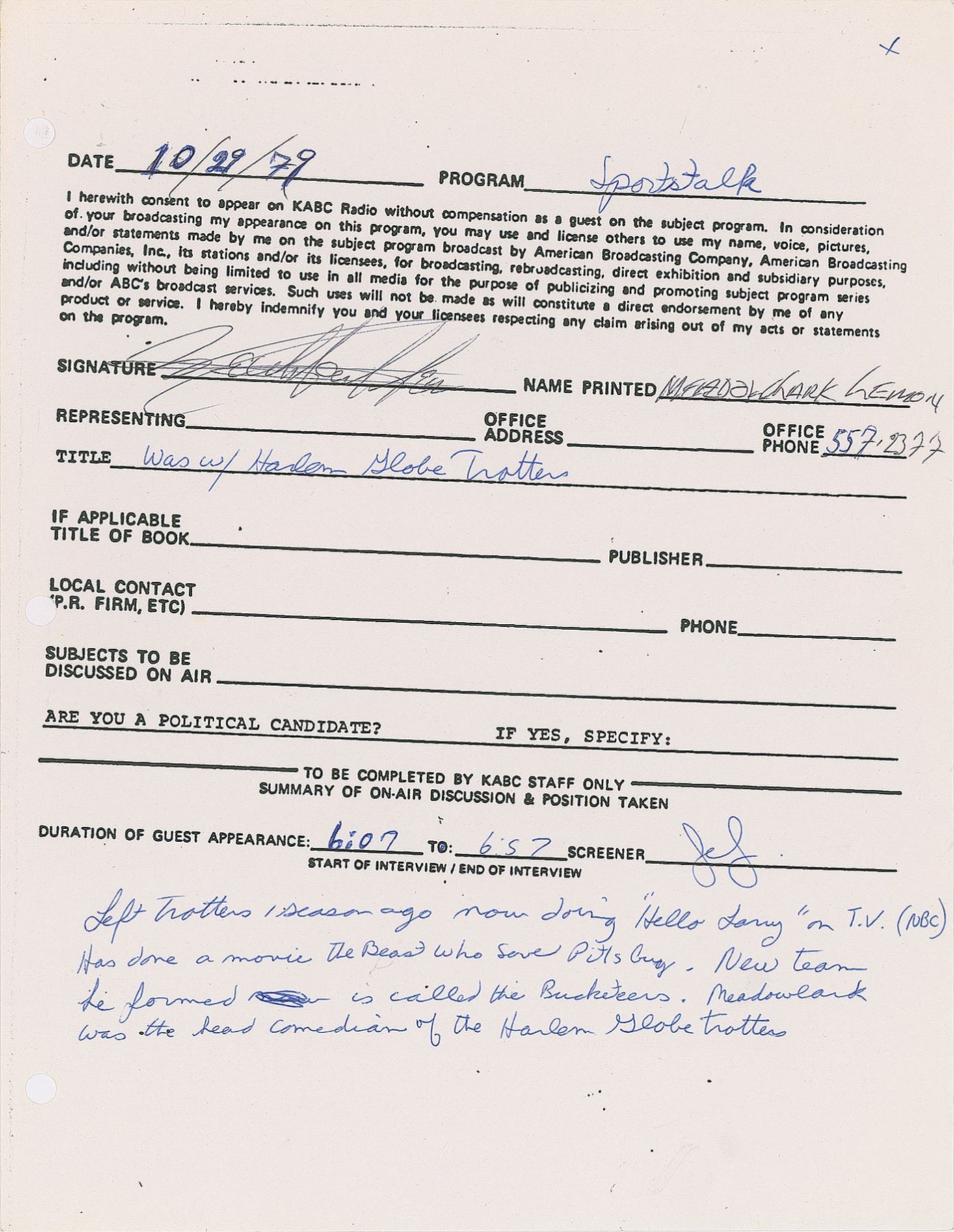 American basketball player, actor, and Christian minister (1932–2015) better known as the 'Clown Prince' of the Harlem Globetrotters; he was inducted into the Naismith Memorial Basketball Hall of Fame in 2003. Twice-signed DS, one page, 8.5 x 11, October 29, 1979. KABC radio consent form for an appearance as a sports talk guest, signed in black ballpoint by Lemon in cursive and in block-letter print, "Meadowlark Lemon." Also filled out in blue ballpoint by a radio station employee with a description of the interview. In fine condition.
