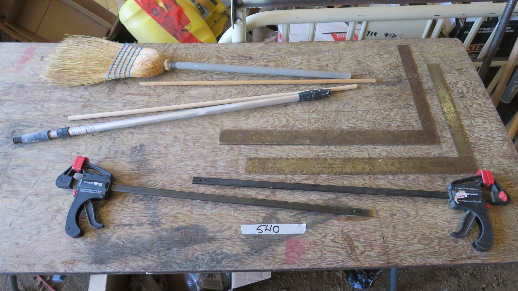 Measuring Squares X2, 24" Ratchet Clamps X2, Dowling X2, Extension Pole and Broom