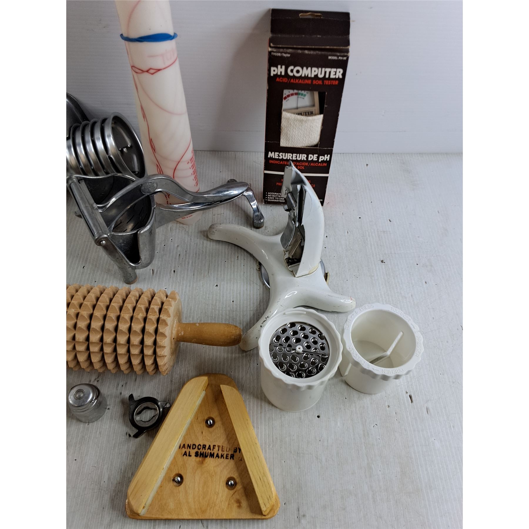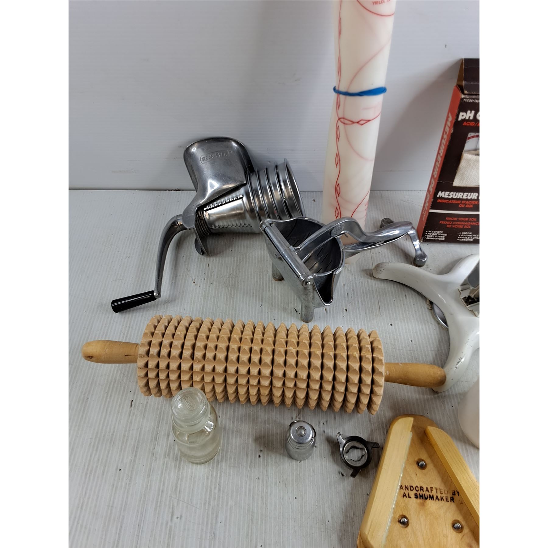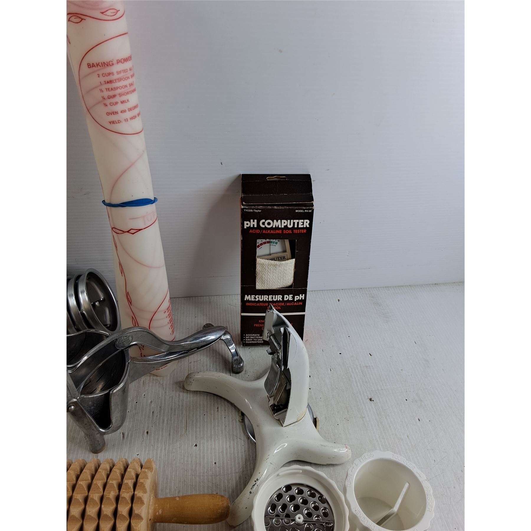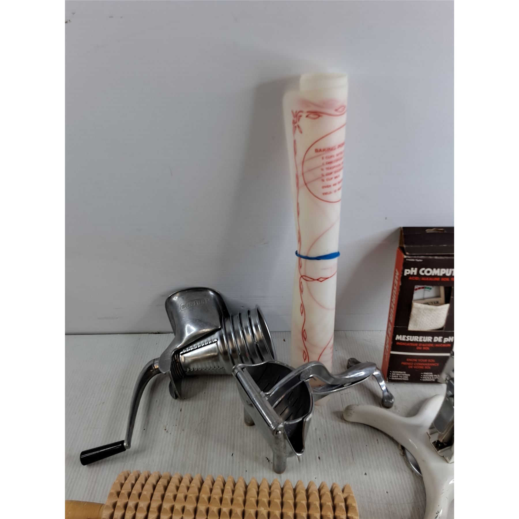 Meat Grinder, Juicer Press, pH Computer, Tupperware Baking Mat, Dough Roller, Misc