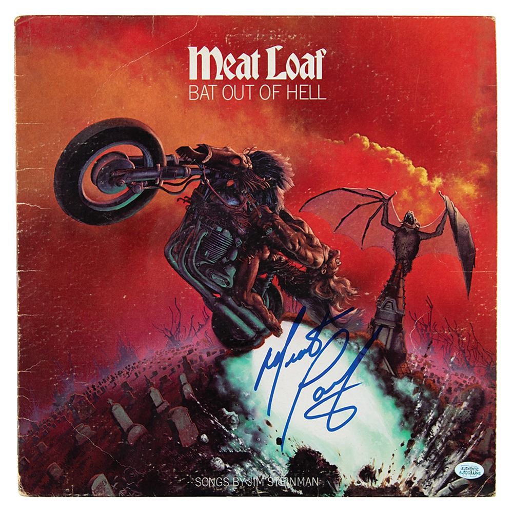 Bat Out of Hell album signed on the front cover in blue felt tip by Meat Loaf. In very good to fine condition, with light scuffing and edge wear. The record is included.
