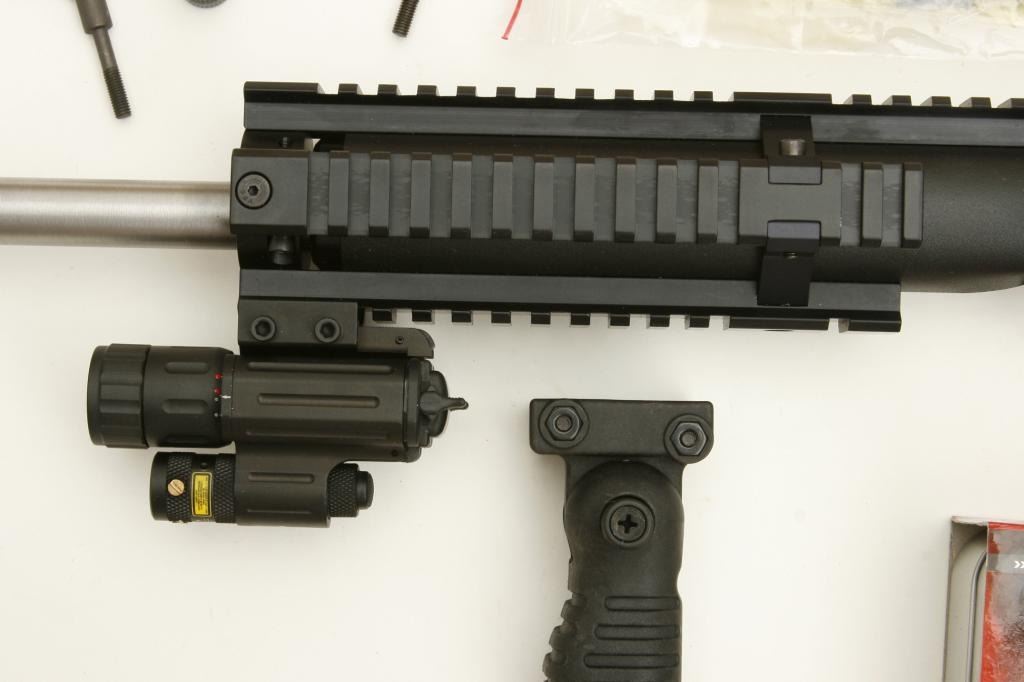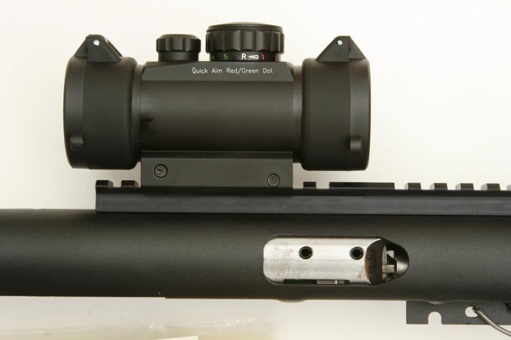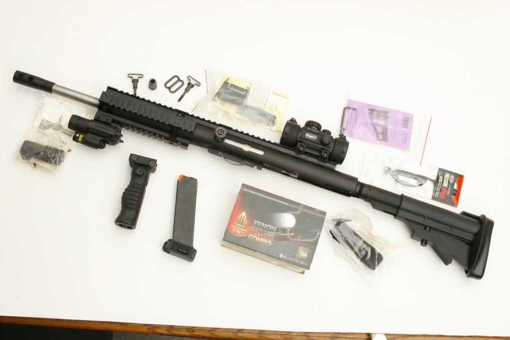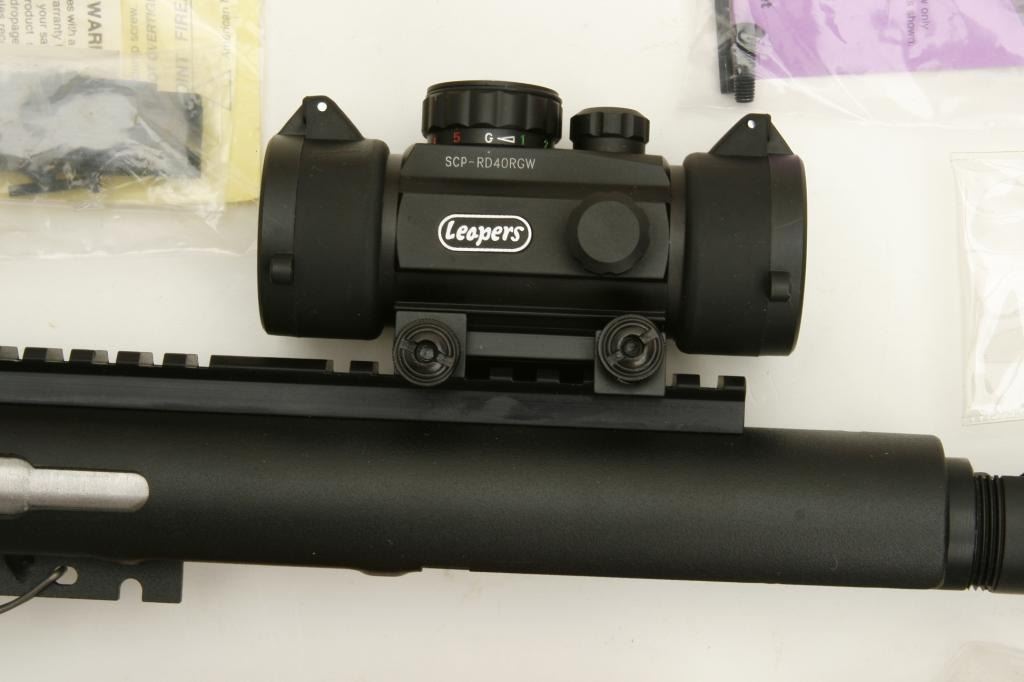 upper only with scope rail and butt stock (no frame)), .45 caliber, mat black finish, with instructions manual and in cardboard shipping box; like new condition; also included is a mounted Leapers scope, one magazine, a UTG Combo red laser and flashlight accessory with pressure switch, and a woven fabric sling. NOTE: BUYER IS RESPONSIBLE FOR CHECKING WITH APPLICABLE STATE AND LOCAL STATUTES CONCERNING THE PURCHASE OR POSSESSION OF THIS CONVERSION UNIT AND RELATED ACCESSORIES. Est.: $250-$500.