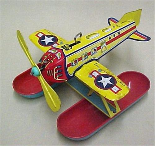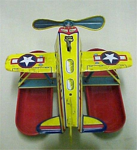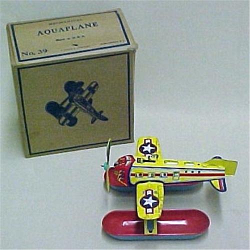 Mechanical Aquaplane with original box; tin wind-up toy; No. 39 by J. Chein & Company Made in the U.S.A Burlington N.J; 8 1/2" across by 4" high; working condition; some scratching on propeller and wing; one box flap torn off.