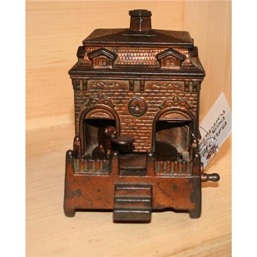 Mechanical Bank - Dog on Turntable Measures approximately 3.25" x 5" x 5" H. Turn handle and dog disappears into house through one door and then emerges from another. Slot in top for depositing coins. Remnants of what appears to be original paint.