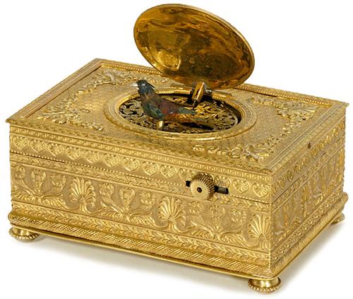 Mechanical Bird Box Solid brass case, with singing bird, it turns around, flaps his wings and opens and closes his beak. - Excellent item in good working condition. - A real great collector's item and exhibition piece!<Br>