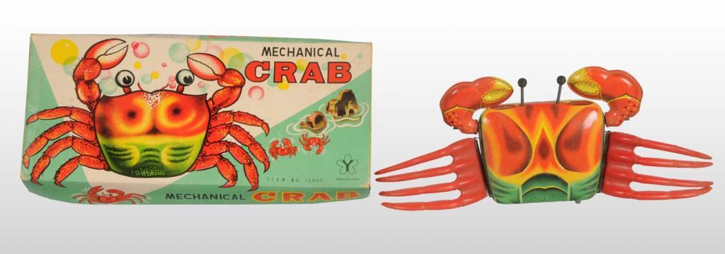 Description Japanese. Made by Yonesowa. Marked "Made in Japan". Unusual and scarce item. Metal base and claws with plastic legs. When wound, crab moves sideways. Operated by both wind-up key and on/off switch. Includes box with cardboard insert and some creasing. Condition (Excellent). Size 6" x 14".