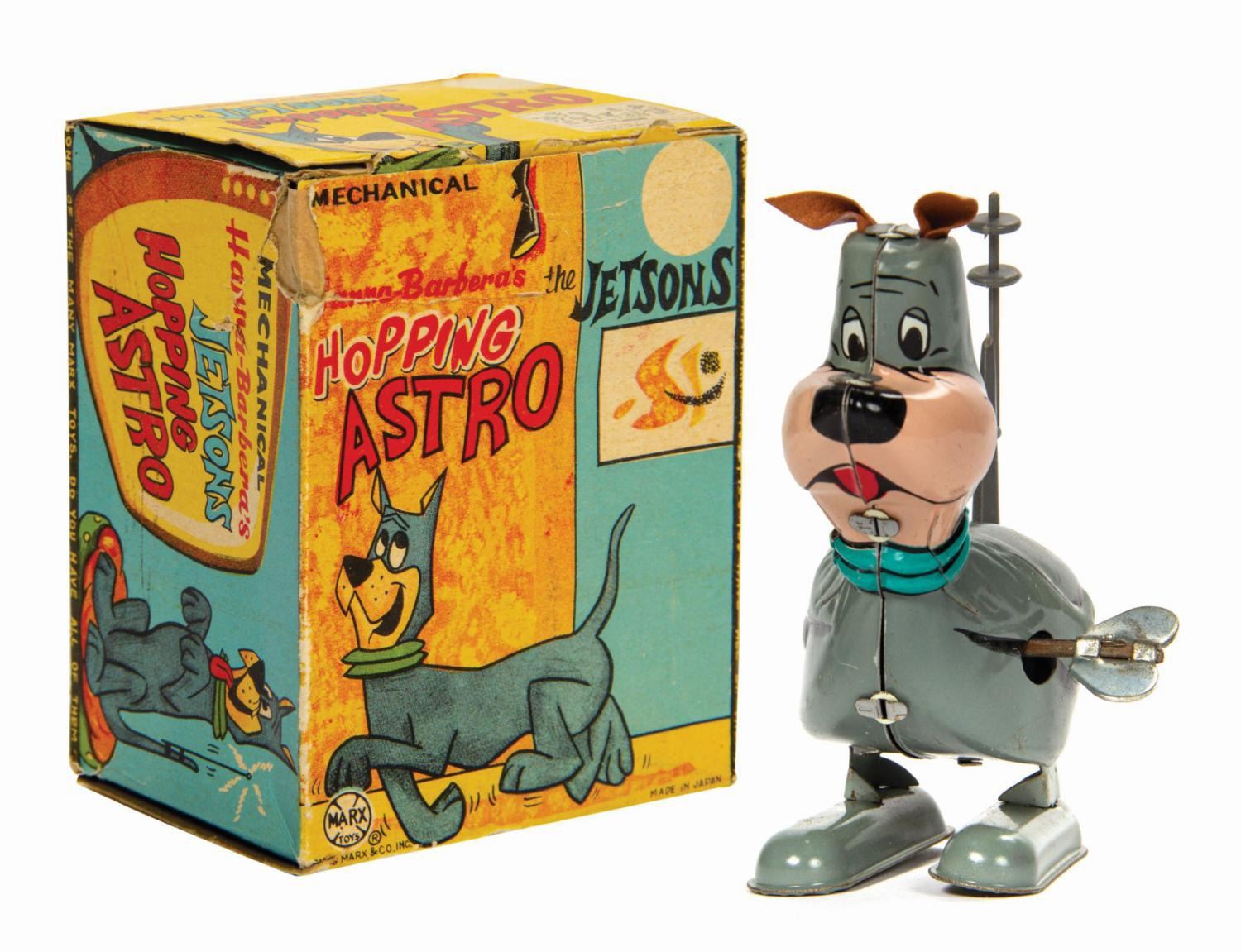 (Marx, 1963) A mechanical Hopping Astro tin toy based on the lovable family dog from The Jetsons. The wind-up toy still functions and comes in its original box. The tin body still includes the delicate plastic tail which is often missing. Standing 4.5" tall, the toy is in very fine condition with minor scuffs to the color from use.