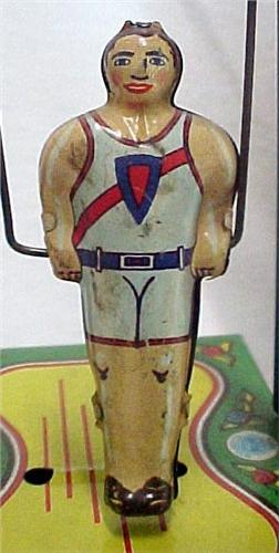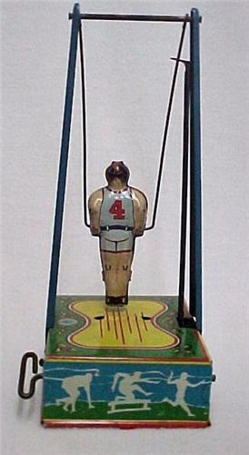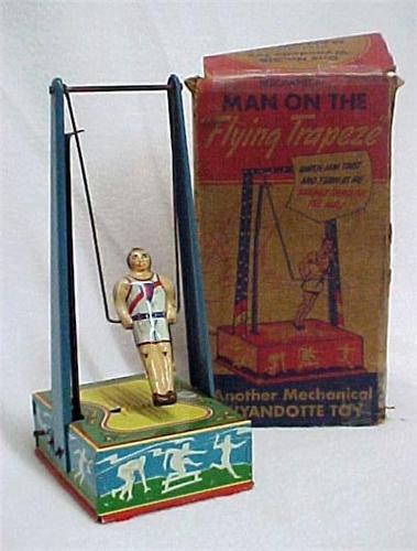 Mechanical Man on the Flying Trapeze; tin wind-up toy with original box; working condition; Wyandotte Michigan USA; 9"high by 4 1/2" across.