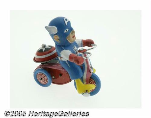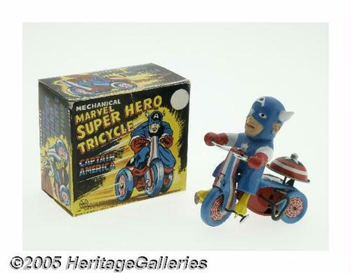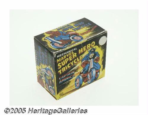 <B>Mechanical Marvel Super Hero Tricycle with Box (Marx, 1968).</B></I> Captain America wind-up tricyle, manufactured by Louis Marx & Company. Made in Japan. Box measures 4.25" x 2.5" x 4". Some slight edge wear to box. Toy in Excellent condition. <I>From the Larry Jacobs Collection.</B></I>