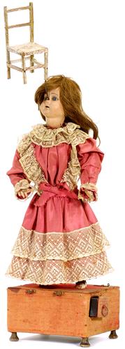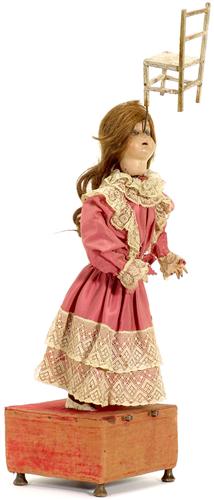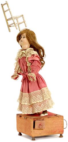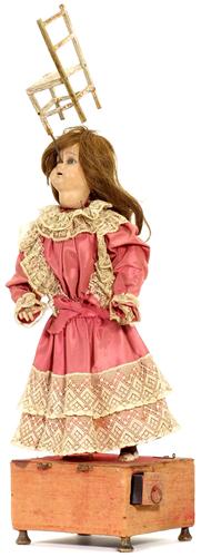 Mechanischer Musik-Puppenautomat "L'Acrobate", um 1880 Hersteller vermutlich "Decamps, Paris", Spielwerk mit einer Melodie. Während die Melodie spielt, balanciert das Mädchen den drehenden Stuhl auf ihrer Nase. Puppenkopf aus Biskuit-Porzellan, mit blauen Glasaugen, Original-Kleidung. 3 Finger beschädigt. Sockel mit Samtstoff bezogen. Gesamthöhe: 62 cm. - Funktioniert hervorragend! - Ein tolles Sammlungsstück!