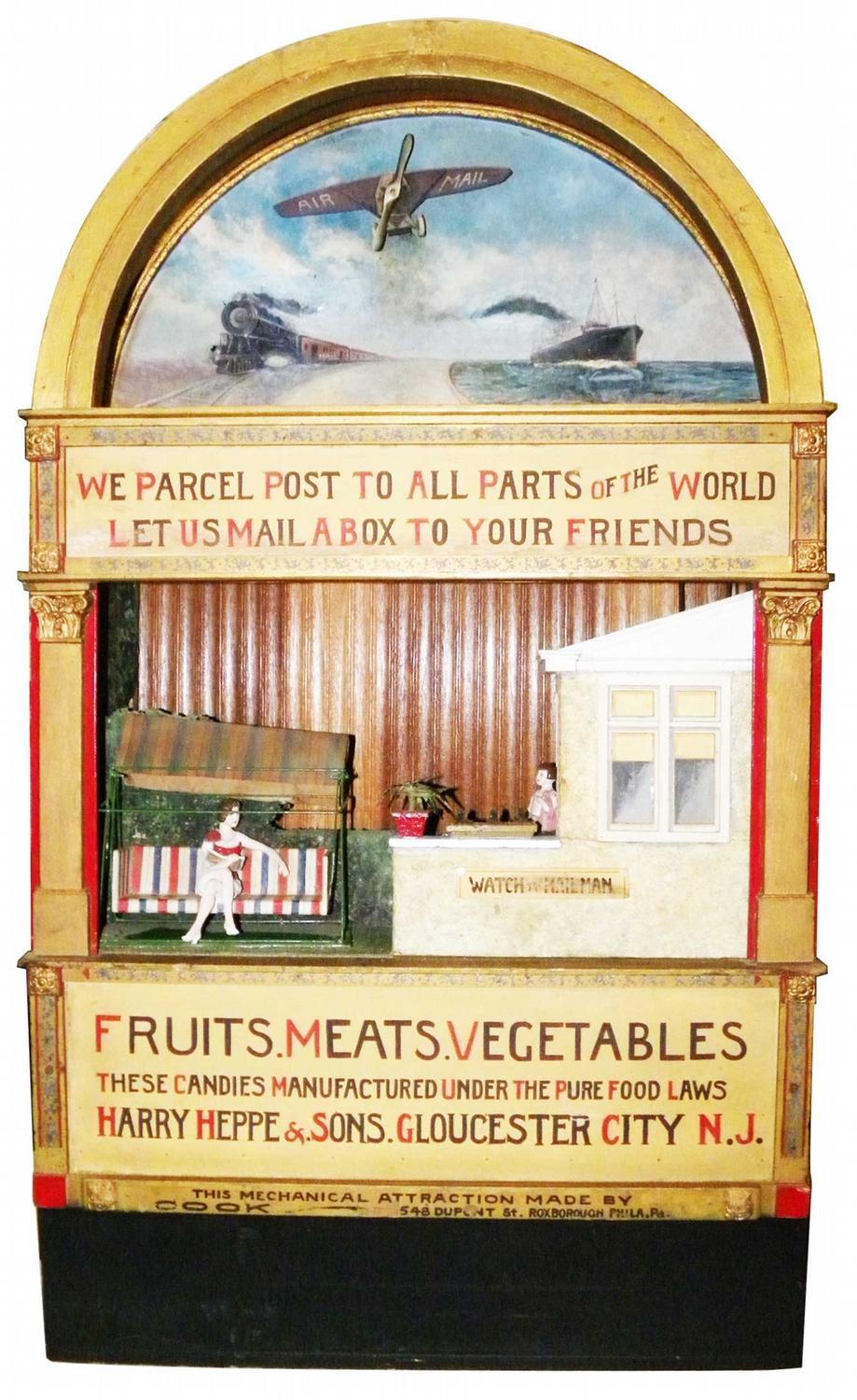 Mechanical Store Display showing a Postman delivering fruit, meats and vegetables to a woman's house. Harry Heppe & Sons Company Distributor, Gloucester City, NJ. Postman delivers box, woman moves back and forth in swing, propeller moves on airplane, wheels turn on train and waves mover below boat. Mfg by Cook, Roxborough, PA. Excellent working condition. 31 X 52 X 13 1/2 inches.