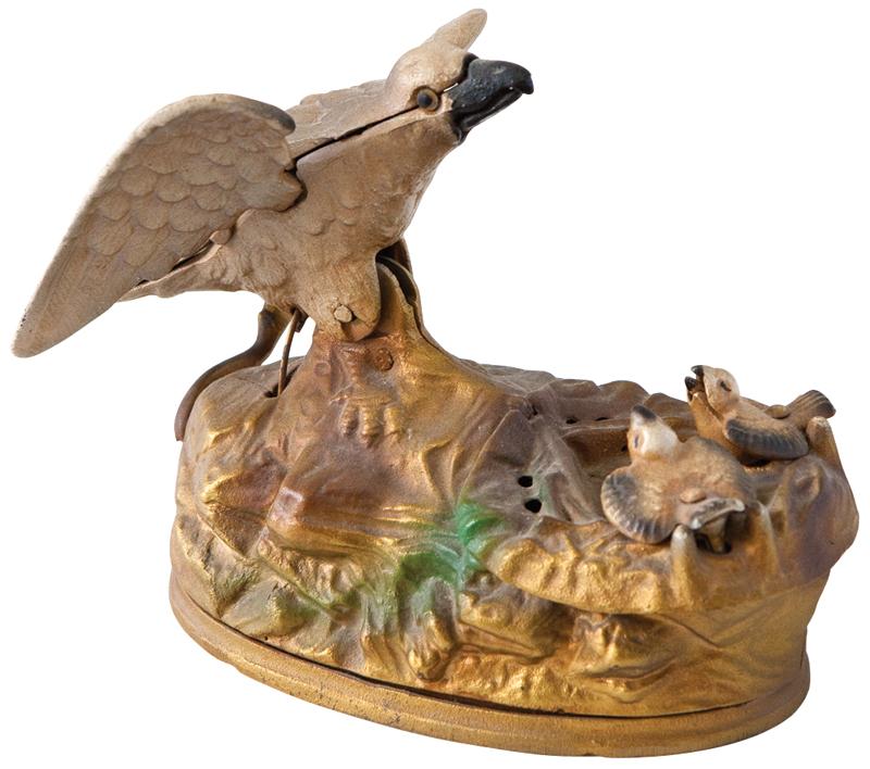 Mechanical bank, Eagle & Eaglets, mfgd by Book of Knowledge, painted cast iron, Exc cond, 6"H x 8"L.
