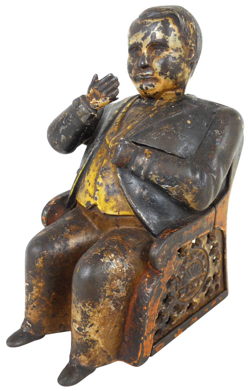 Mechanical bank, Tammany, mfgd by J&E Stevens, designed by John Hall, patd 1873, cast iron w/some orig paint, VG cond, 6"H.