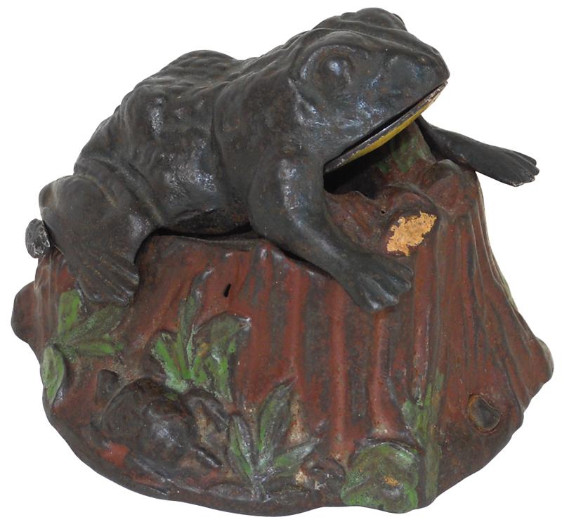 Mechanical bank, Toad on Stump, mfgd by J&E Stevens, cast iron w/orig paint, Exc cond w/wonderful paint, 3.25"H x 4"L.