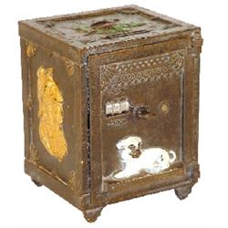 Mechanical bank, Watchdog Safe, J&E Stevens, painted fancy cast iron, dog on front moves mouth when coin is deposited, VG condition w/some paint, 4.5"W x 6"H.
