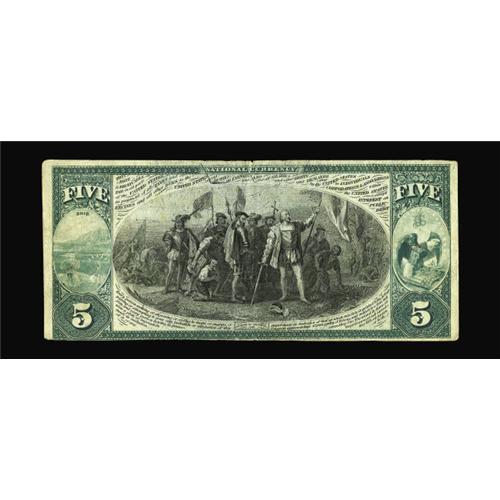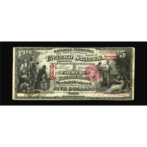 <B>Mechanicsburgh, OH</B></I> - $5 1875 Fr. 401 <B>The Farmers NB</B></I> Ch. # 2325<BR>This bank was chartered in February of 1876 and was liquidated just a single day after its fifth anniversary, having issued a mere $45,540 in face value of the $5 1875 series. By 1910 a scant $390 face value of its emissions remained in the hands of the public and just $20 of that is now known, including this latest addition to the census, a lovely <B>Extremely Fine.</B></I> All the notes previously in the census are listed at that grade and two of those are just a single Treasury serial number digit away from this note, suggesting that all may have been held by the same owner at one time and that the few light folds are present from storage rather than actual circulation. Subtle margin roughness is noted and there are a couple of pinholes. In a note of such rarity, however, these attributes affect nothing. The original officers' hand signed signatures are fully legible, the Cashier signing in black and the more flamboyant President in red. Just over 110 $5 1875 notes are known for the entire state. This is certainly in the top 10% condition wise. Whether your primary motivation as a collector is condition or rarity, this is certainly a note you will take considerable pride in owning and by adding this to your holdings will have the satisfaction of being the custodian of a wonderful Ohio rarity.