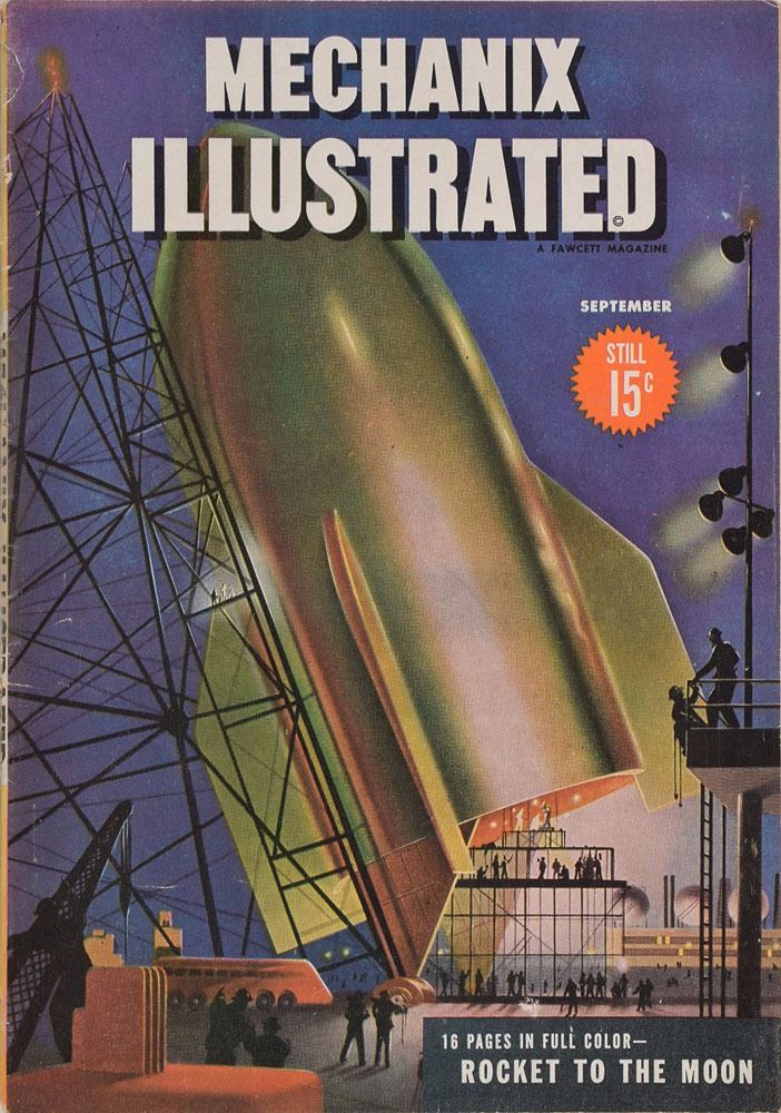 Scarce copy of Mechanix Illustrated magazine from September 1945, 6.5 x 9.5, 162 pages, with the front cover featuring a brilliant color depiction of a large rocket with workers and spotlights all around, text in lower left reading: "16 Pages In Full Color—Rocket To The Moon." The magazine is highlighted by an article by acclaimed science writer Willy Ley entitled "Rocket to the Moon," with synopsis reading: "The ever-fascinating problem of space travel to the moon is examined factually and scientifically by expert Willy Ley, and illustrated with full color paintings by Chesley Bonestell." In very good to fine condition, with instances of wear and tape-repaired tears to spine, index page still attached but pulled free from staple binding, and some separation to upper portion of magazine jacket; the covers and interior pages remain in crisp, clean condition.