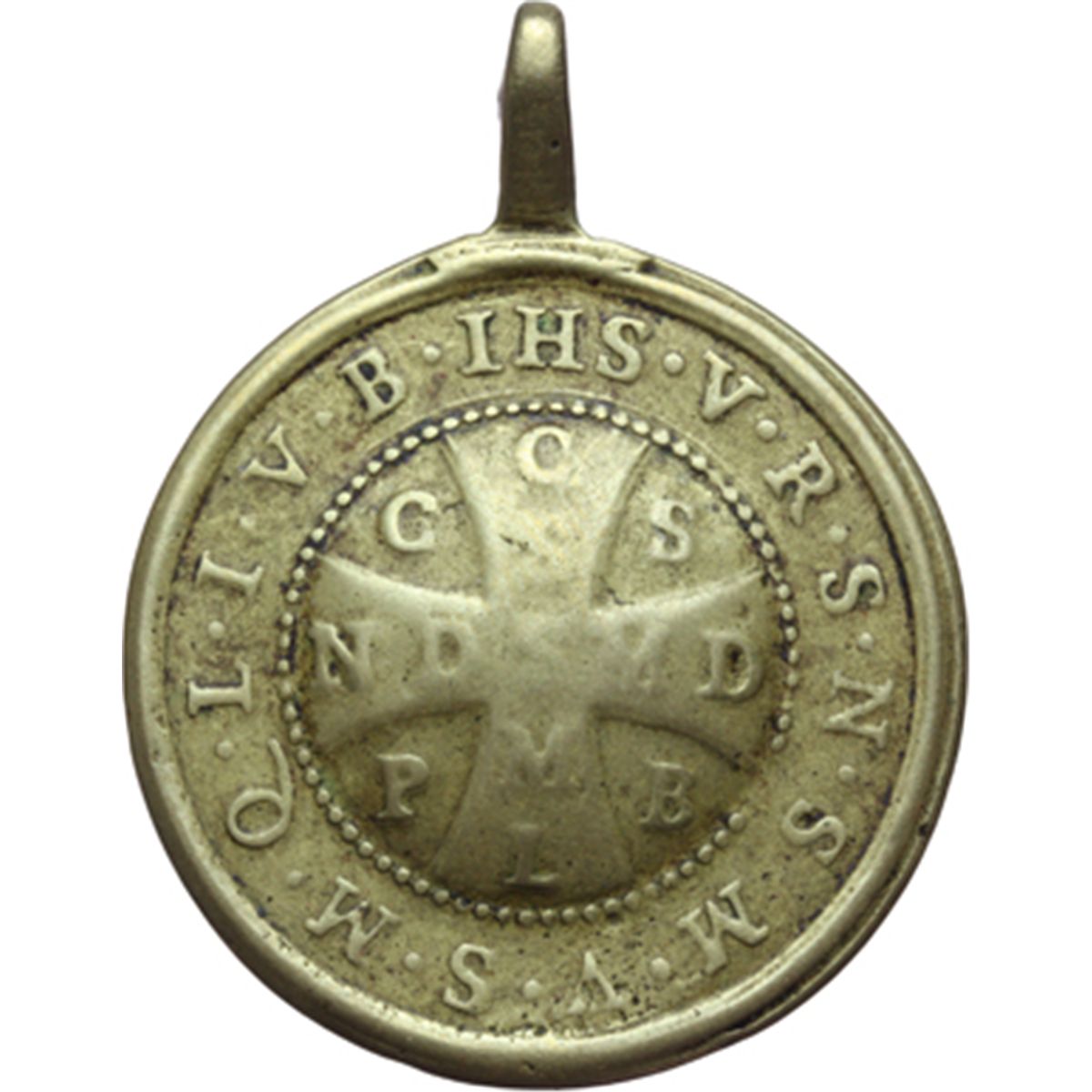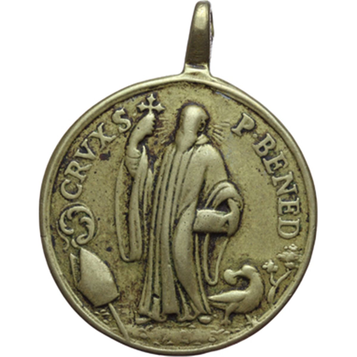 Medaglie devozionali. Medaglia circa XVIII sec. Abazia di Santa Maria di Montserrat. D/ CRVXS P. BENED. San Benedetto con i suoi emblemata: bastone pastorale e corvo imperiale. R/ Croce di San Benedetto. AE. mm. 34.00 Appiccagnolo coevo, consunzione dovuta ad usura da utilizzo. BB. La medaglia riporta lettere che sono parte di un potente esorcismo; la tradizione vuole che, se benedetta, abbia effetti contro le insidie del demonio, i pericoli e le malattie degli animali domestici.