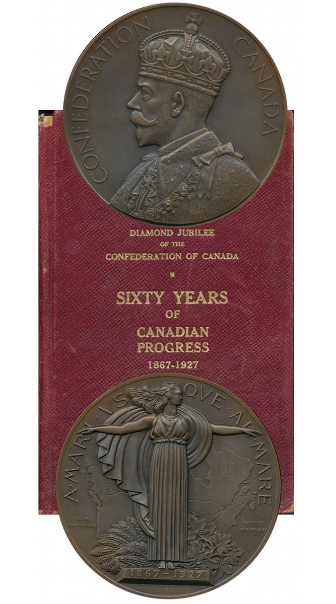 Medal; 1867-1927 Commerative Confederation of Canada Bronze Medal portraying George V on one side and Standing Lady in Robe with arms through A MARI VSQVE AD MARE in legend. 75mm in diameter. Medal come with Diamond Jubilee of the Conferation of Canada SIXTY YEARS OF CANADIAN PROGRESS 1867-1927 by James Malcolm, Minister of Trade and Commerce. Book is average condition & Medal comes in original blue box.
