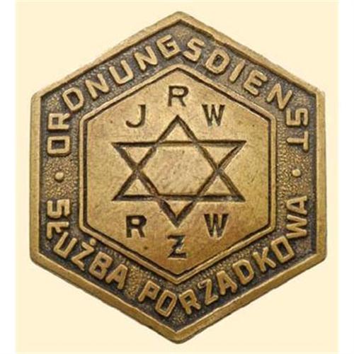 Tombak, one part construction, size 33,1 x 37,8 mm. Averse stamped "J RW/RZW" (Judenrat Warschau); screw on reverse, maker's mark "KASPRZYKIEWICZ SZMAKFEFER, WARSZAWA…", reverse silver grey plated, thin material! These kind of badges are normally copies (different quality), but this looks originally! Evident signs of wearing! WES 1020 var.