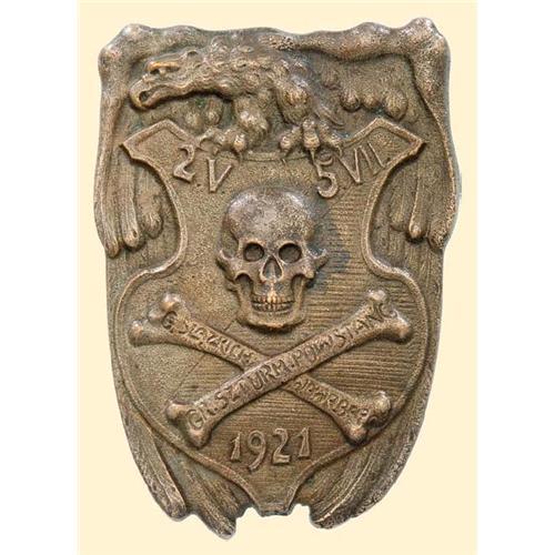 Cast bronze patinated, one part construction, size 41,1 x 58,3 mm; screw on reverse, small six pointed iron nut, no maker's mark. Impressive solid design and quality in tradition of Austrian "Sturmtruppen". Signs of age, minimal spots of verdigris. WES 933
