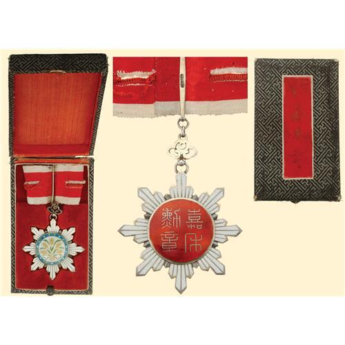 Commander`s Cross (3rd Class), 2nd type, silver enamelled. Original suspension loop, ribbon and silk box with Chinese inscription in best condition.