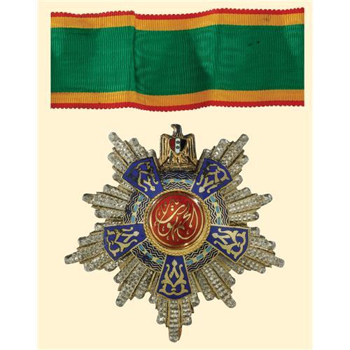 Grand Cross or Grand Officer Breast star; breast star, silver, brilliant cut, superimposed parts enamelled, centre medallion gold (?); hallmarks and Arabic maker`s mark on reverse; with medium pin and a commander`s ribbon.