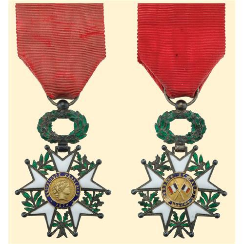 Knight`s Cross of the Third Republic (1870 - 1947); silver hallmarked, luxury model with gold centres, original suspension ring and ribbon. Some enamel damage.