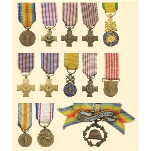 Lot de of Miniatures, 6 Combattant`s Crosses of 1914-18; 2 Interallied Victory Medals; 1 Commemorative Medal of 1914; 1 for the French Reconnaissance, 1st model in bronze; 2 Military Medals of the Fourth Republic; a Badge for the " anciens combattants de la Haute Saône" (a veteran`s Organization). (13 pieces in all ).