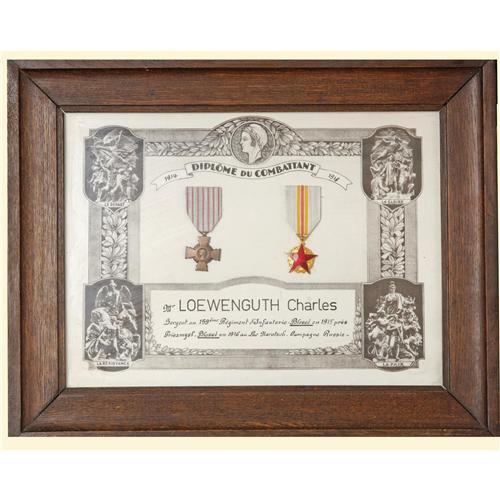 Framed certificate with Combatant's Cross and the Wounded Medal awarded to "Loewenguth,