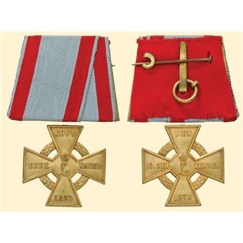 Bronze, thin version with granulated arms; connection between cross and loop is broken, but loop, suspension ring and original ribbon-clasp (old style) come with this lot. This version was produced for private purchase and intended to be mounted on a group.