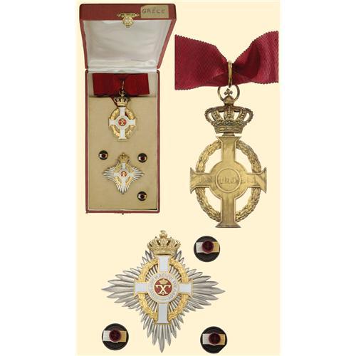 Grand Officer`s set for civil by Kelaidis, with case of issue. Breast star, silver, superimposed parts silver-gilt and enamelled, large pin and two sides hooks, maker`s mark "Kelaidis" on the pin. Commander`s cross, silver gilt, one side enamelled with movable crown and suspension ring, with ribbon. Case of issue with cipher of King George II on the lid. Extremely fine set in perfect condition!