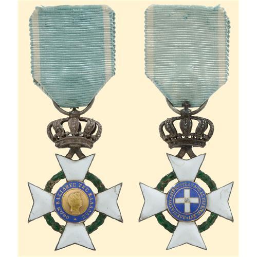 Knight`s Cross (Silver Cross) of the Redeemer 1st type, silver, gold centres. Original suspension ring and ribbon, with crown. Some enamel chips on points and in the green wreath but a very pleasent order in very fine condition. Rare!