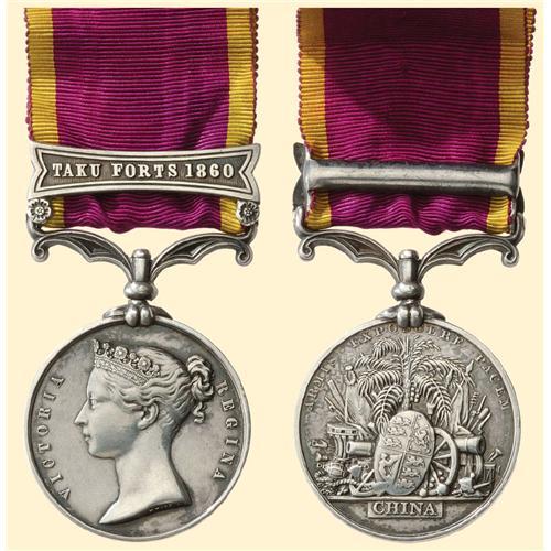 Breast Badge in silver. Queen Victoria profile ("Wyon"). Unnamed with clasp "Taku Forts 1860". Some polishing. Old ribbon.