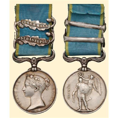 Silver Medal, Queen Victoria profile ("Wyon"), with 2 clasps Sebastopol & Inkermann. Clasps loose
