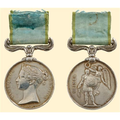 Crimea Medal 1854; silver, Queen Victoria profile ("Wyon"), unnamed, with ornamental swivel suspension, with a piece of old ribbon. Minor edge knocks.