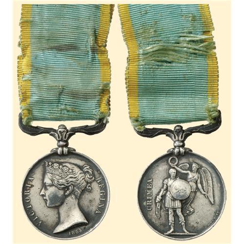 Crimea Medal 1854; silver, Queen Victoria profile ("Wyon"), unnamed, with ornamental swivel suspension, with old ribbon. Some contact marks on the surface, has been polished long time ago, dark patina.